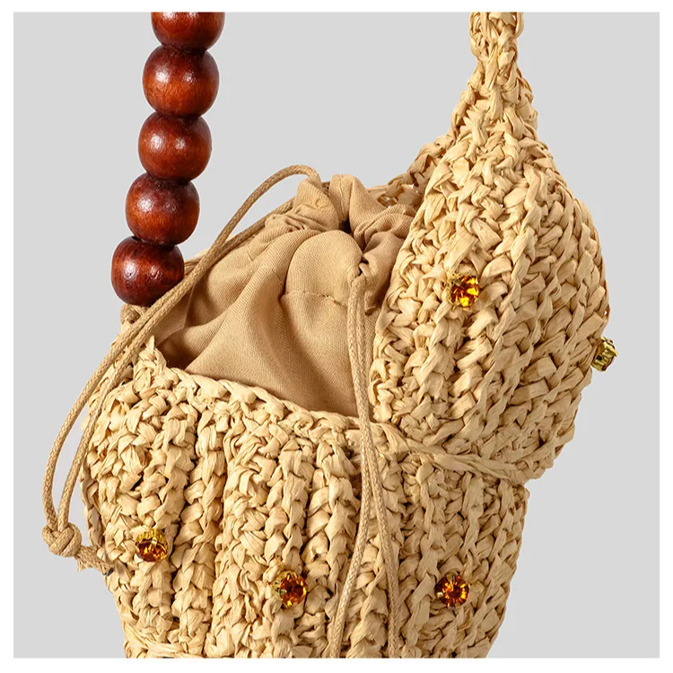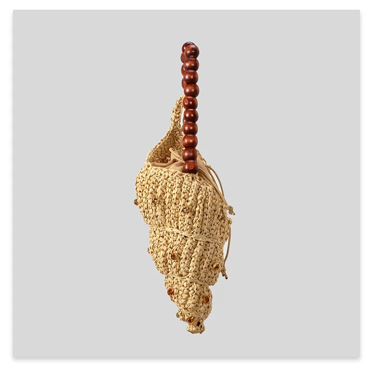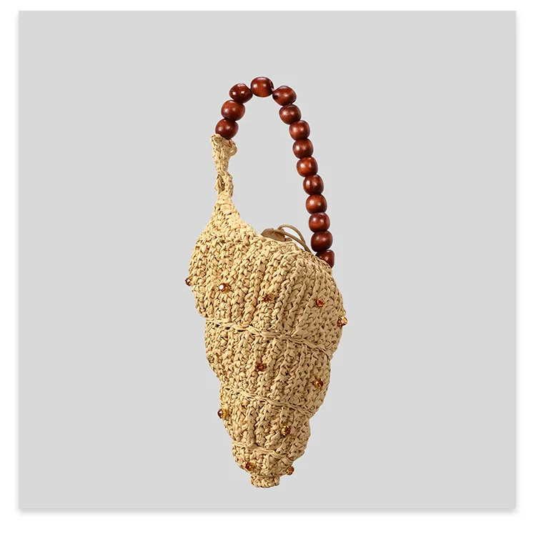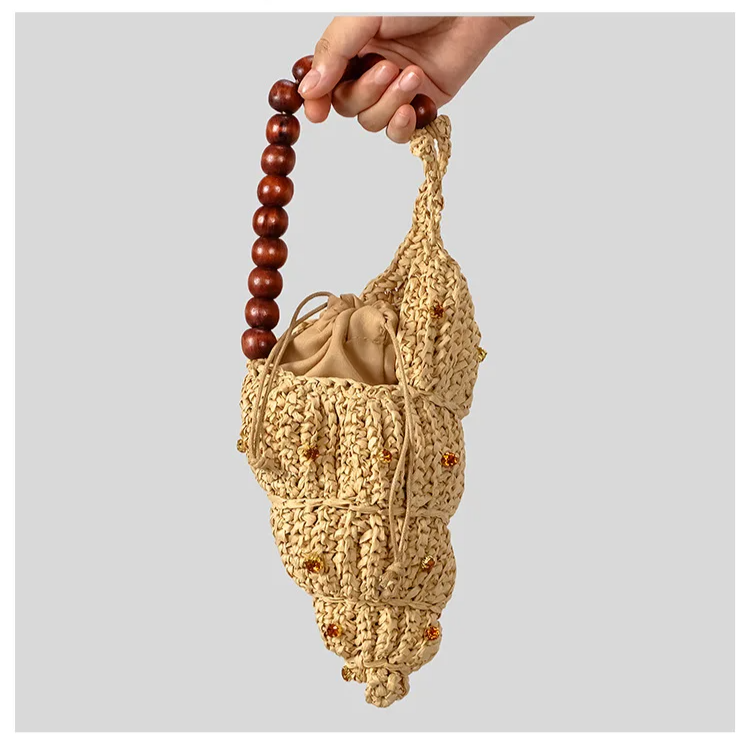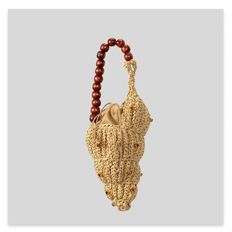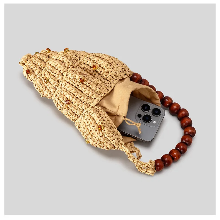 O destaque fica por conta da alça com contas, que adiciona personalidade e um toque artesanal contemporâneo à peça, transformando a bolsa em um verdadeiro acessório de estilo. O fechamento em formato de saquinho garante praticidade, enquanto o acabamento delicado reforça sua exclusividade.